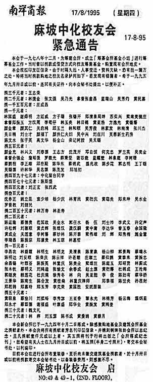本会于一九七八年十二月,为筹建会所,成立[筹募会所基金小组]进行筹募基金工作.当时曾以捐款或借贷方式向校友筹集基金,购置现有会所地皮。 本会现拟印发证信录,由于时隔久远,人事变迁,资料欠缺,恐有挂一记万之处,特将当时捐款购地之校友名录胪列如下,若发现有错用者,希于一九九五年九月卅日或以前,连同有关证件,向本会秘书处提出,以便补正。 捐三千元者:王志荣 捐二千元者:林捷金 张文强 吴乃光 拿督张愈昌 蓝瑞山 吴劳灼 黄民嘉 捐一千五百元者:巫成昌 捐一千元者: 林国盛 谢舜明 方廷威 方子珊 张锡开 郑清泉局绅 苏荣兴 梁南美镜庄 拿督郑振玉 方汉周 李苟仔 林玉炎 林日锦 黄亚浩 方逸光 黄锡藩 颜金章 颜其仁 关启鸿 邱玉兰 林和顺 吴芳俊 林家发 林南清 张川杰 吴日精 刘士才 颜福丁 颜泱仁夫妇 吴中兴 刘在川 芙蓉新生药房陈文水 张子英 高文华 杨金山 荣记树胶 吴天赐 捐五百元者: 颜金充 林兴义 刘春源 王志方 沈茂开 邓白但 何克忠 罗兰英 吴美金 掌督余镇业 詹裕後 罗微光 薛秉坚 谢谷栽 蓝耀璧 林泉鹿 李树珊 蔡鹏程 李正雄 邱洽殿 陈华东 察锦武 温兆政 陈步升 郭志明 王丁赐 吴赐源 许林华 吴名源 陈茂发 郑旭初 损四百九十七元者:中化留台同学 损四百七十七元者:陈斯湿 损四百元者:刘正玄 张烈武 捐叁百元者: 沈务正 姚立昆 袁少培 杨少庆 林有民 黄衍庆 黄聪炎 郑来坤 吴水金 罗曾教 刘健民 捐二百五十元老:林万寿 林圣寿 捐二百元者: 陈运隆 蔡德贵 范国政 吴金水 郭任水 杨 伍 刘士沛 李武义 许定声 许松辉 刘德顺 费贞辉 张维汉 龚汉麟 黄中庸 李达华 曾玉春 余国隆 黄成业 关莲意 李树藩 蔡妙林 陈开泰 梁伟雄 刘 辉 郑秀梅 施金慧 李瑞昌 陈振宗 郑兼贵 林玉琼 林惠哲 捐一百元者: 李昌农 林碧霞 林明生 林明龙 吴清泉 陈育象 杨山柳 郭景陶 蔡瑞水陈明达 刘安顺 陈荣庆 陈云样 许若潮 庄淑兰 察仰鹏 黄泰来 黄振忠 余昌锡 叶雅答 陈振英 林重庆 陈美业 梁维注 陈庭玉 郑昭贤 林蔚成 张木钦 蔡明义 刘鸿逵 张愉文 余春成 赵土源 黄衍藩 杜锦成 王沧海 郭继庚 赖莲花 杜庆满 徐秀冬 林 向 吴亚能 李 俊 陈劲有 蔡华娇王景华 陈南生 陈合发 黄桂桑 林重庆律师 郑泰福 陈世炎 孙荏封郑淞骋 郑嘉玲 郑玉芳 李克荣 黄国胜 安妮服装 饰五十元者: 黄联泉 蔡淦川 刘祺裕 李秀瑟 王亚香 梨永光 林锦芬 杨云海 温炳星 郑永才 蔡霖德 谢福盛 叶康盛 郑华全 黄报发 黄鸿奎 捐三十元者:魏文礼 捐二十元者:林 萍 刘玉瑟 陈书成 黄爱娟 黄碧月 本会新会所已于一九九四年十月二日落成。除感激购地基金及建筑会所基金之捐献者外,本会决将所有捐献春芳名刊印证信录,并镌刻铜牌张卦会所以志纪念, 且凡捐献一千元或以上者,其玉照将刊于行将出版之[会所落成纪念刊], 故希望有关人士在九月卅日或以前,将玉照(半身二寸照片),奇交本会秘书处,以利编印。 目前本会在进行会所布置装修, 至祈尚未缴交建筑基金捐款者,於十月卅日以前将捐款寄交本会秘书处,以备装修费用,则感激不尽。 |